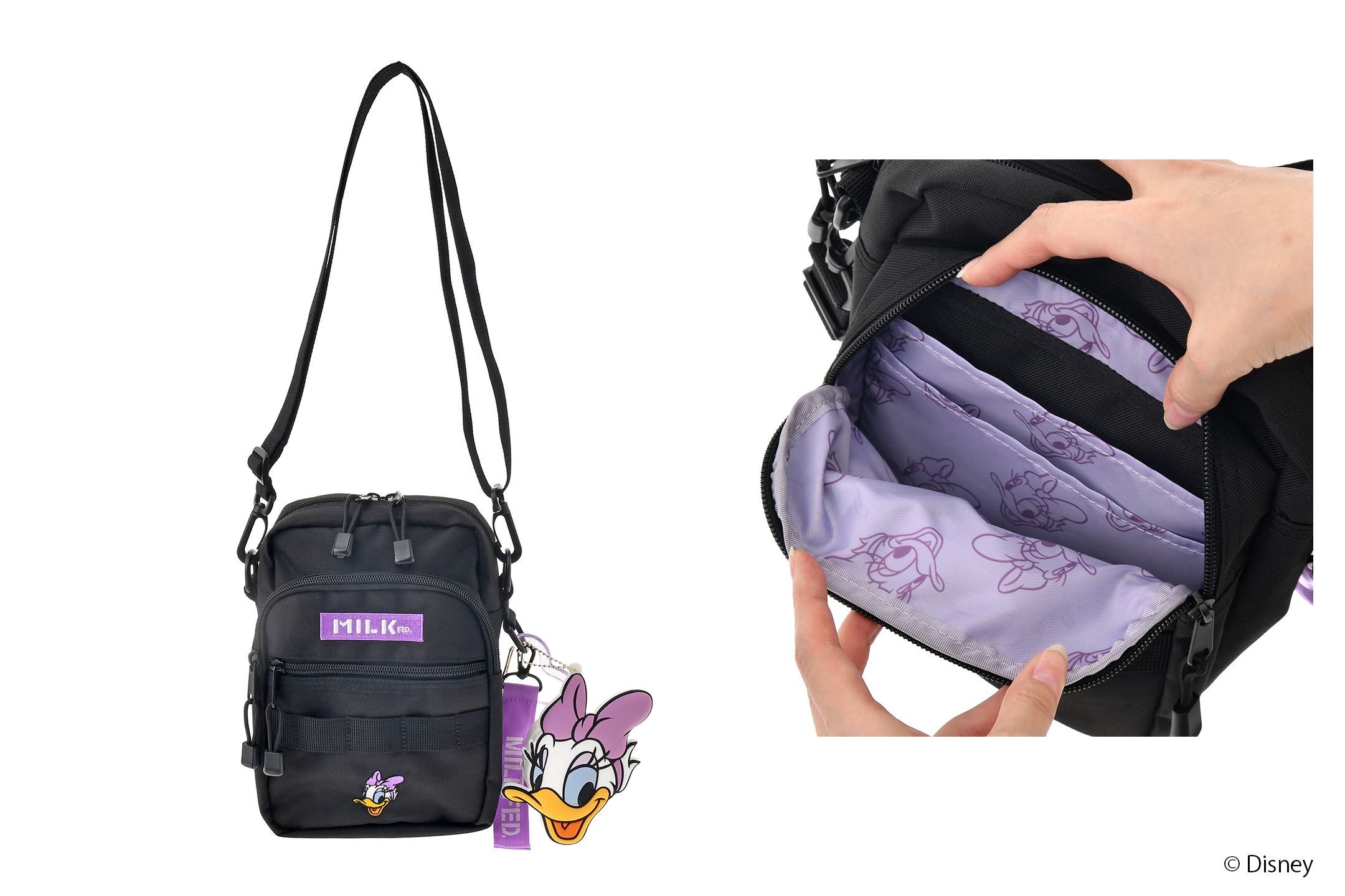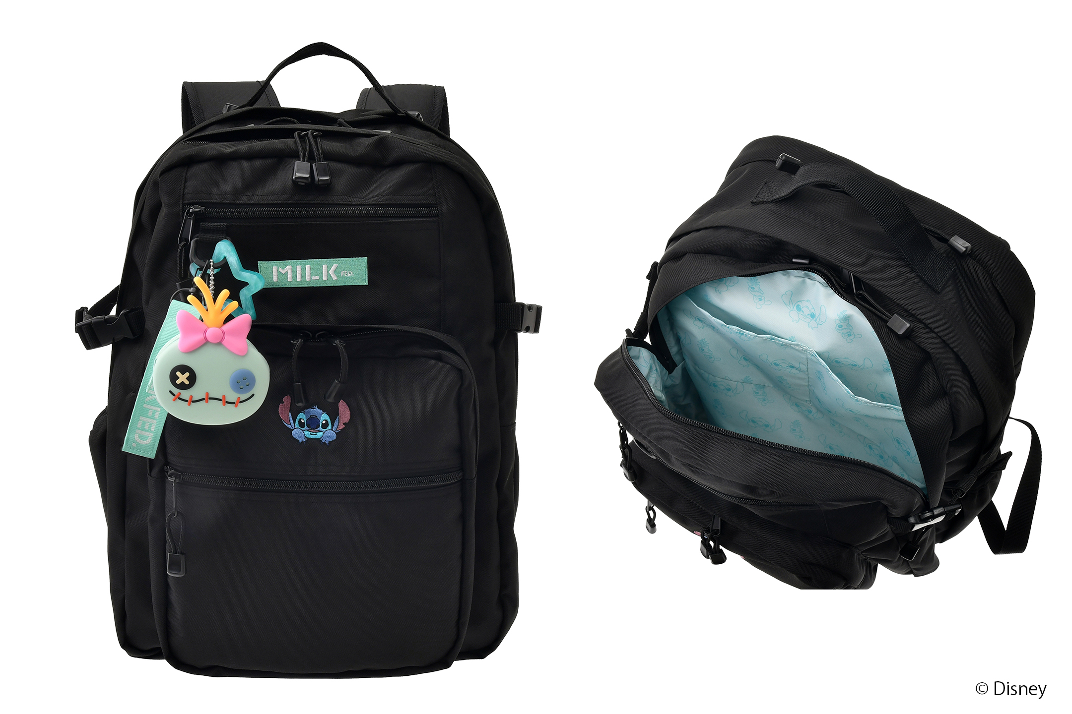 バックパックとショルダーバッグは裏地にそれぞれのキャラクターがプリントされた特別仕様。付属のチャームやポーチは好きな場所に付け替えたり、お手持ちのアイテムに付けて楽しむこともできます。キャラクターたちのキュートな表情が魅力的な、共同企画ならではのオリジナルデザインとなっております。